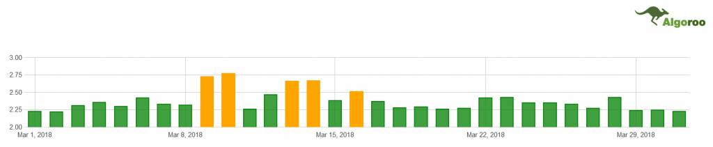 Though Algoroo places Google’s spike of updates on March 14th and 16th, it agrees with AccuRanker that Google was up to something around that time. Anything in yellow is considered “high roo” and shows more volatility in search results. Algoroo only reported five days of code yellow—less than January 2018’s 20 days of yellow, but definitely more than February 2018’s solo day. Will April take on a marigold tinge? Algoroo seems to show the numbers leveling off at the end of March, so only time will tell.