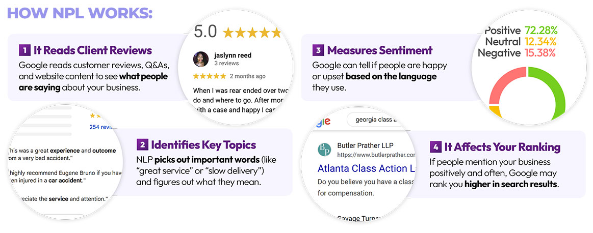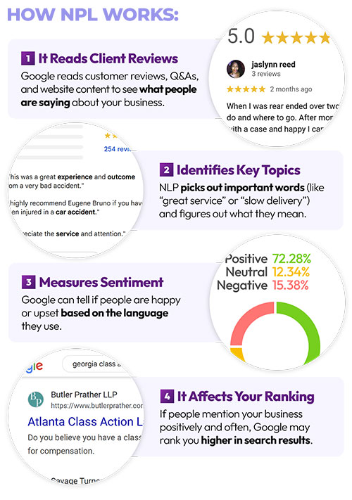 Natural language processing (NLP) is a branch of artificial intelligence (AI) that enables computers to understand human language. NLP helps Google determine what clients are saying about your services, their satisfaction level, and their overall experience with your firm. This can affect your search ranking, especially if the reviews consistently highlight your knowledge and success in specific legal areas.